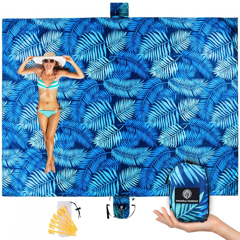 URBANECO OUTDOORS Lightweight Beach Blanket - Oversized 107" x 77" Waterproof Sandproof - Double Anchored for Fun Leisure Beach Blanket - with Stake Pouch & Plastic Stakes Durable Sand Beach Mat
