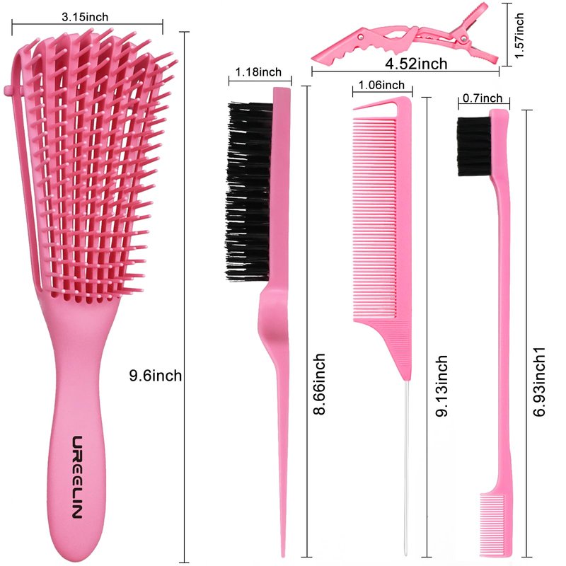 UREELIN Detangling Brush set,Detangler Hair Brush with Teasing & Edge Brush for Curly Hiar, Rat Tail Comb Alligator Hair Clips for 3a to 4c Kinky Wavy/Curly/Coily/Wet/Dry/Oil/Thick/Long Hair(Pink)