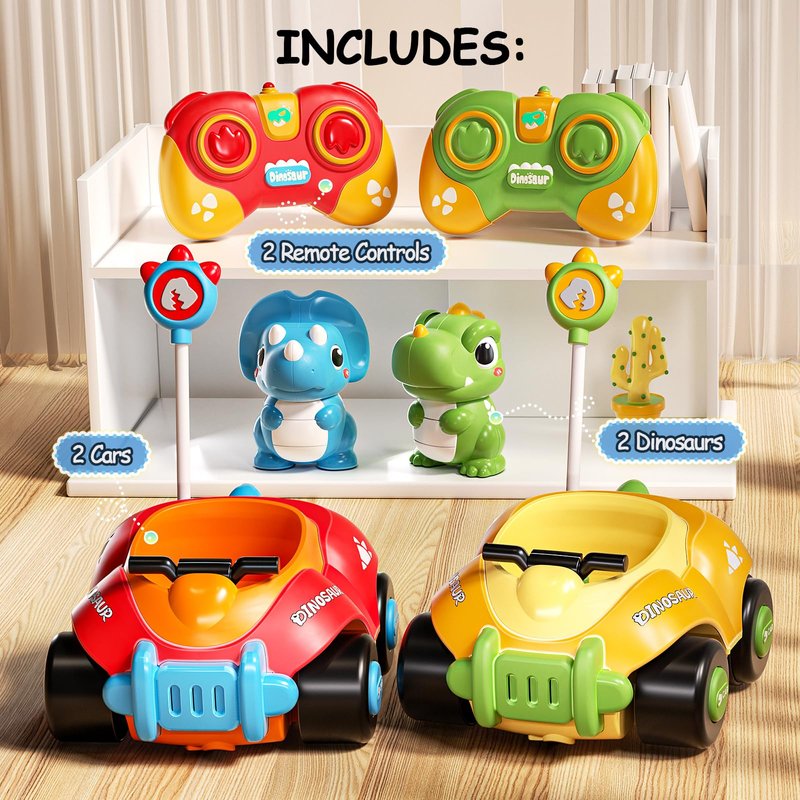 Uregoio 2 Pack Remote Control Cars for Toddlers 1-3, Dinosaur Car for Kids Age 2-4, Babies Toys for 18+Months, RC Car with LED Lights & Music, Boys and Girls Christmas Birthday Gifts 2 3 4 5 Years Old