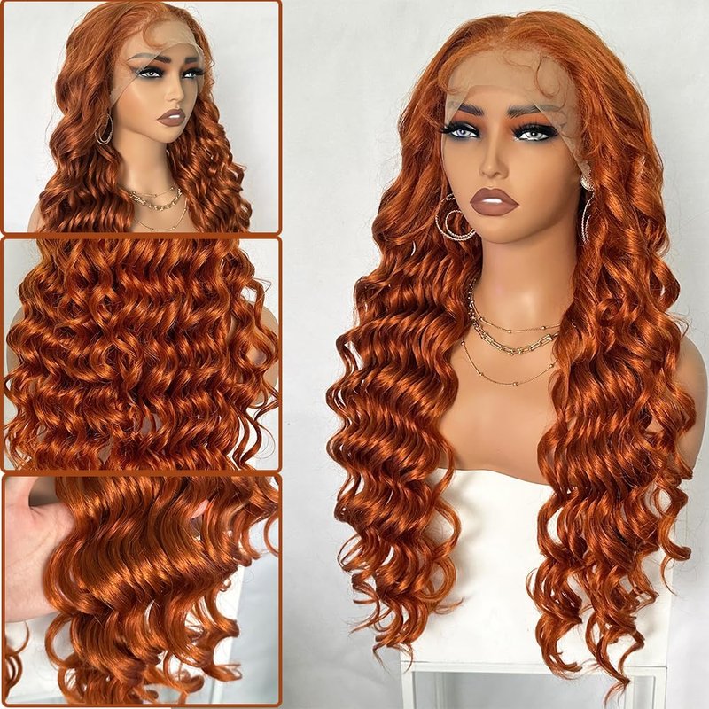 UREMY 13x6 Lace Frontal Reddish Wig 30 Inch Bouncy Curly Synthetic Hair Preplucked with Baby Hair Transparent Swiss Lace Heat Friendly Cooper Ginger Free Part Lace Front Wigs for Women