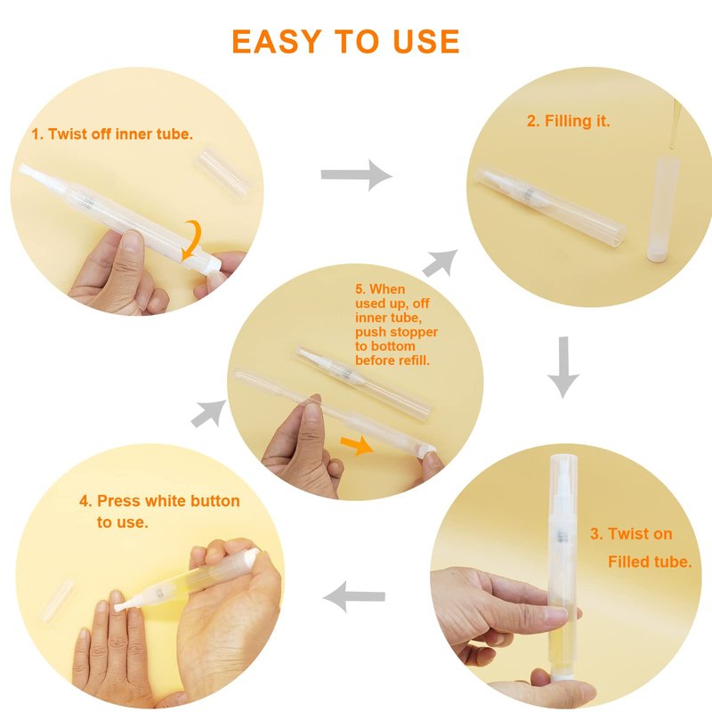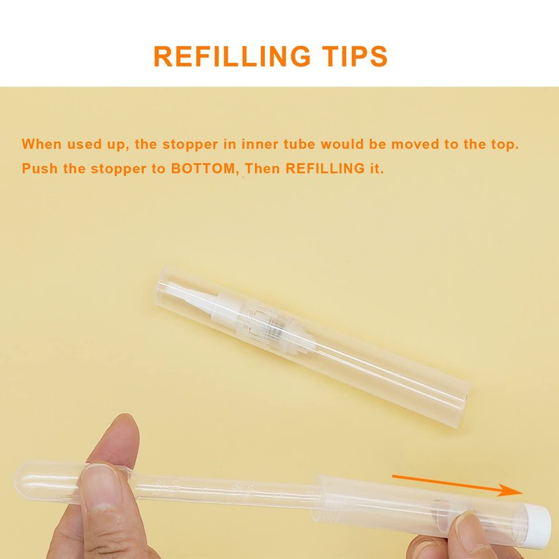 - ð ãRefillable and Eco-FriendlyãUnlike disposable pens, these upgraded refillable cuticle oil pens are designed to be reused, can be easily take it apart for refilling.This saves money and reduces waste,eco-friendly, making them a sustainable choice for nail care.