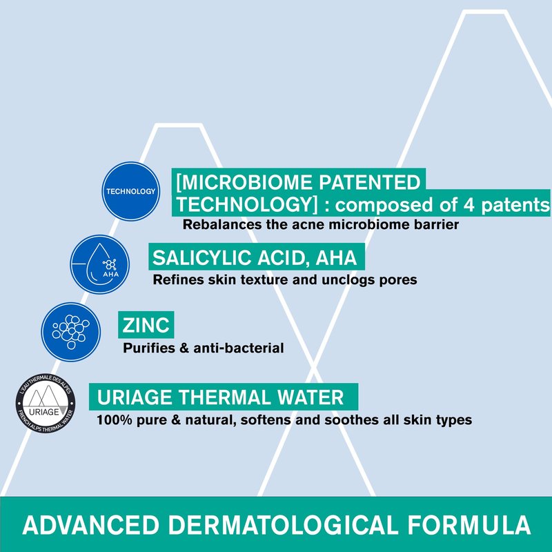 Global skincare, both for the "treatment" of sebum, blackheads, and spots and as a "background regimen" against the main causes (triple regulation): -61% of spots after 2 months; Less sebum, blackheads and spots. Skin is refined and pores are tightened. Contains one of the highest concentrations of AHA yet with excellent tolerance Fewer scars, Fewer rebounds: contains high amount of calcium, which provides a soothing effect to the skin, and a combination of Copper & Zinc, which favors the healing of the tissues.Its richness in manganese & magnesium guarantees antioxidant protection and the action of silicon softens and create a permeable film that retains water and maintains the correct hydration of the epidermis. With Uriage Thermal Water in the heart of all Uriage formulations, our different products are isotonic, thanks to their high concentration of minerals and trace elements, as well as highly moisturizing, thanks to its composition close to NMF (Natural Moisturizing Factor).
