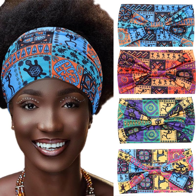 Urieo 4 Pcs African Turban Headband for Women Printed Hairband Knotted Stretchy Head Band Workout Yoga Non Slip Wide Headbands