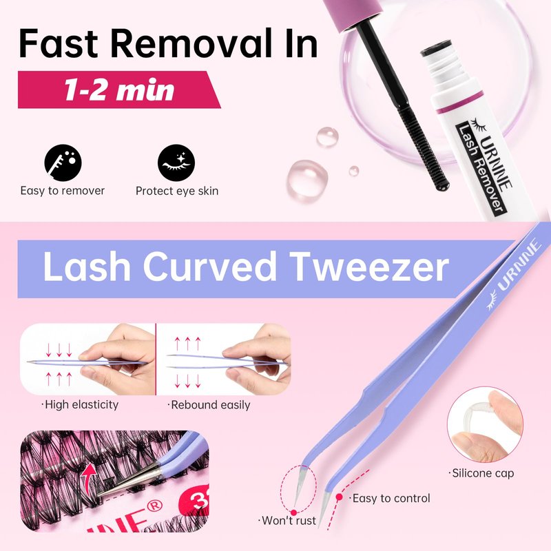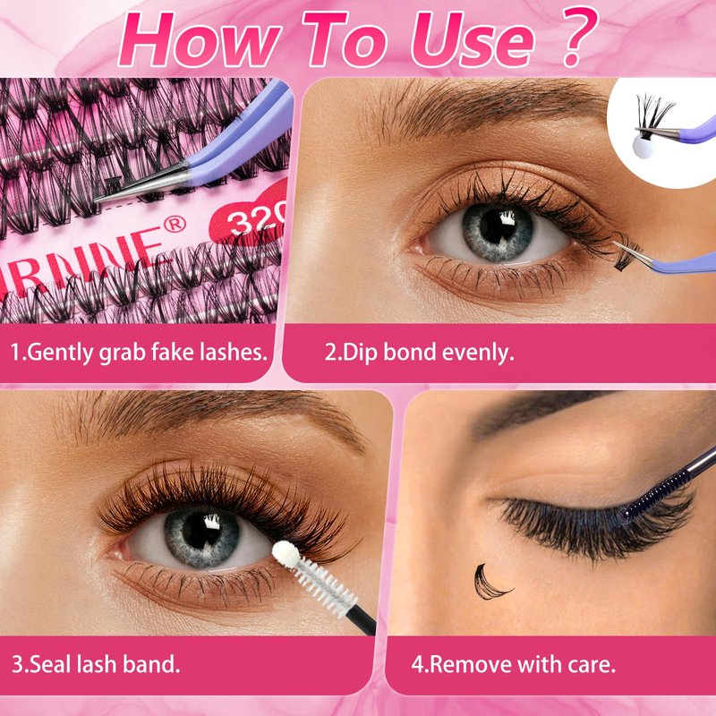 - Lash Extension Kit: Perfect for everyday wear, parties, and beginners, these thin band lash clusters are designed to suit most eye shapes. Featuring a mix of 30D and 40D curls, with lengths ranging from 9- 16mm (320 pcs), it come with everything you need for lash extensions—like a 2-in-1 bond and seal, remover, tweezers, and brush to achieve salon quality results with DIY application at home