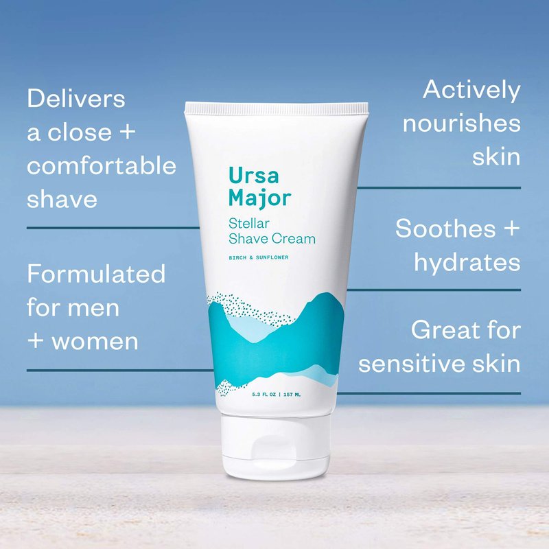 - URSA MAJOR STELLAR SHAVE CREAM - This concentrated, non-lathering natural shaving cream minimizes nicks, cushions against razor burn and naturally nourishes your skin. The sublime texture, robust natural aroma and extraordinary performance will leave you craving your next shave.