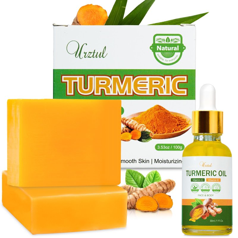 URZTUL 2 PCS Turmeric Soap Bar & 1 Pack Turmeric Oil for Face & Body, Nautral Tumeric Skin Care Soap Deep Cleanses, Soothing, Hydrating Turmeric Vitamin C Vitamin E Oil for All Skin Type