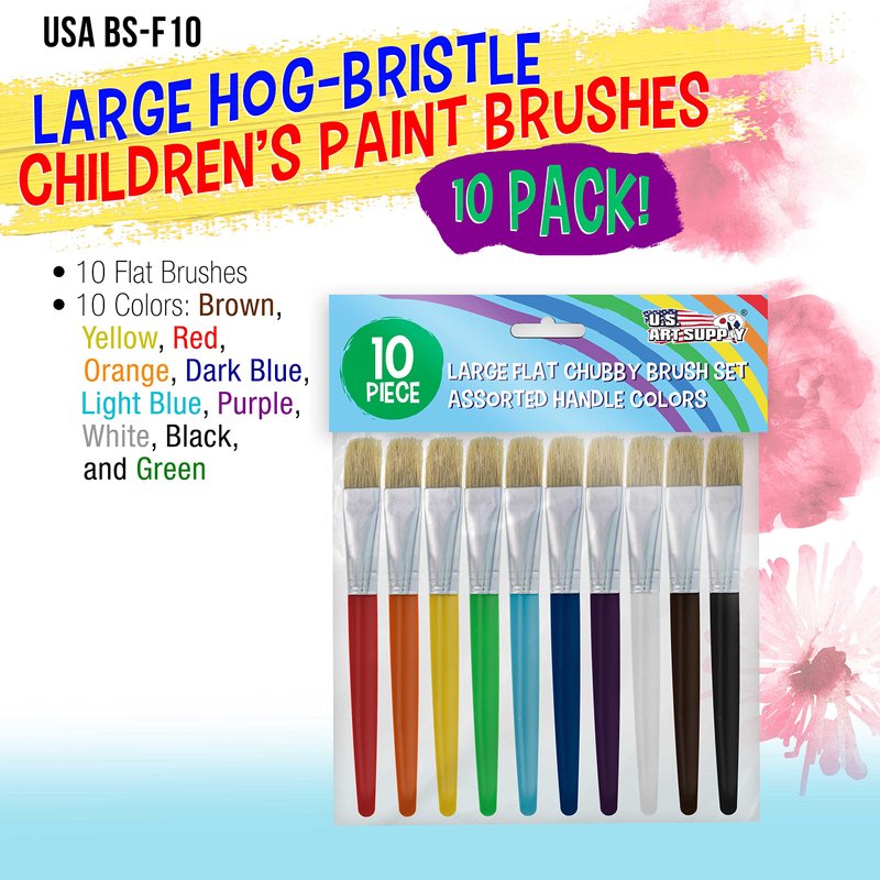 U.S. Art Supply 10-Piece Large Flat Children's Chubby Hog Bristle Tempera Paint Brush Set - Fun Kid's Party, School, Student, Class Craft Painting - Beginners Starter Artist Painting Brush Kit