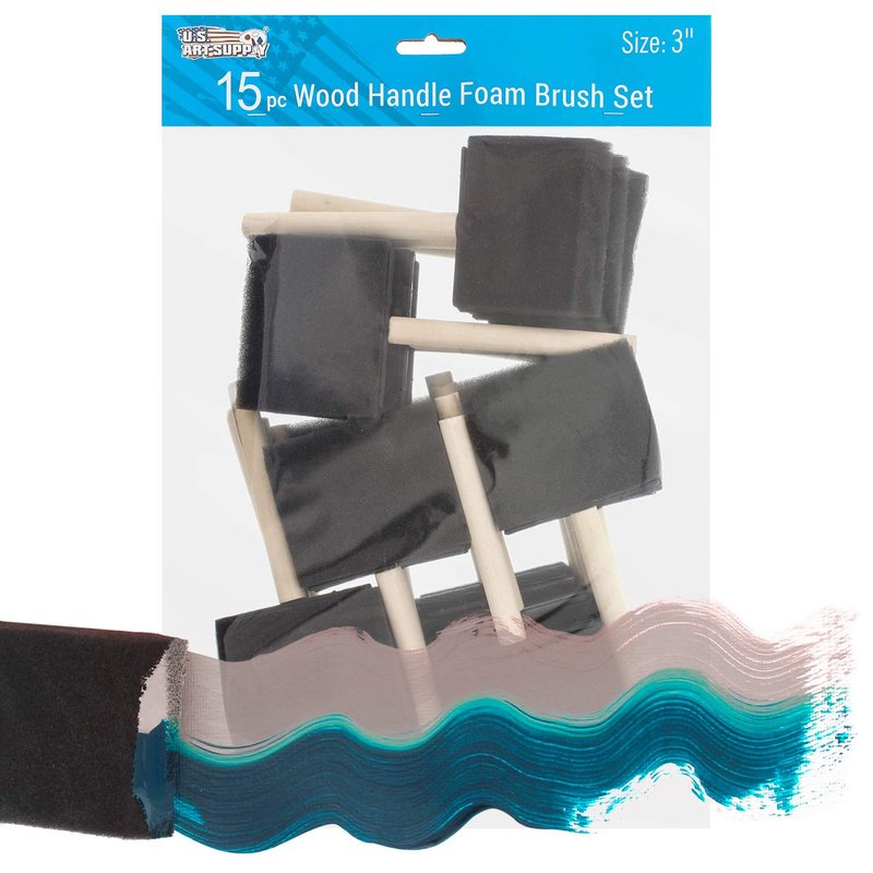 US Art Supply 3 inch Foam Sponge Wood Handle Paint Brush Set (Value Pack of 15) - Lightweight, Durable and Great for Acrylics, Stains, Varnishes, Crafts, Art