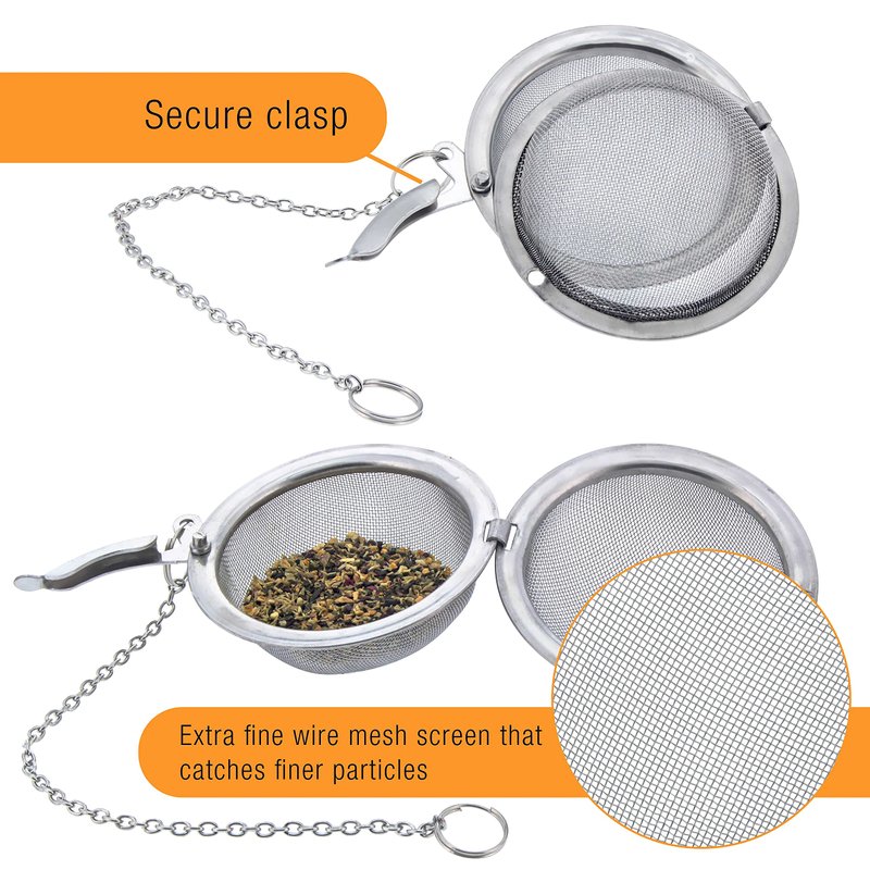 - 2 Professional Tea Ball Strainers: Set of 2 premium quality durable 2.1" diameter stainless steel tea ball strainer infusers with extra fine mesh. They're made with a rust-proof extra fine wire mesh screen that catches finer particles, and that ensures particle and debris free steeping. The attached chain allows you to hang the tea balls from a teapot, tea cup, coffee mug, panhandle or stockpot. Easy to clean and dishwasher safe.