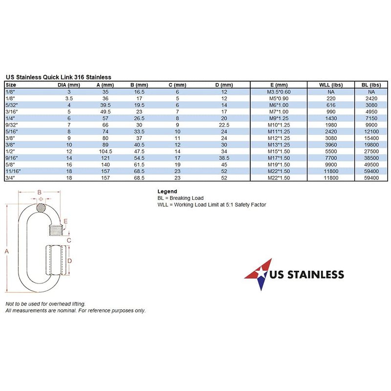 This is for one (1) quality marine grade stainless steel (AISI 316) quick link 9/16". Each quick link is stamped 316 and laser etched 9/16" with the makers mark. The quick links are marked in the US specification style of 9/16". The metric equivalent is generally considered to be 14mm. Not to be used for overhead lifting. AISI 316 stainless is a premium grade of stainless and is considered by many to be best in class. 316 stainless is corrosion resistant and very durable even in the harshest of conditions. Breaking Load = 38500lbs
