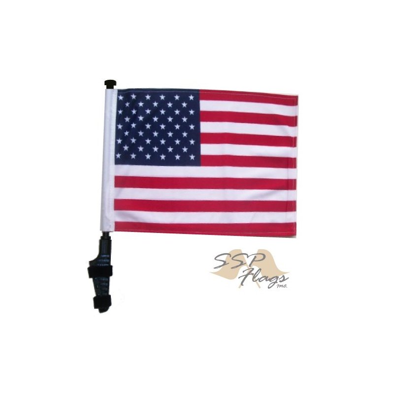 UNITED STATES GOLF CART FLAG WITH POLE APPROX. FLAG SIZE: 11 in. x 15 in. 100 % Polyester Fabric Material Double-Sided / 2 Ply Flag Includes the USA Golf Cart Flag and pole with the SSP Flags EZ On & Off Bracket (For Standard Size 1in. Roof Support Bars / See Diagram Image)