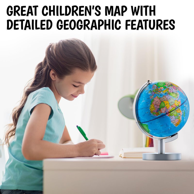 - LIGHT UP GLOBE SPECS: Our plug in globe for kids measures 9.75” tall (base to top) and 7.2” in diameter, is perfect for children 3 and up making it a fantastic tool for geography lessons and interactive learning; Package includes 1 Globe, 1 x Guidebook, 1 x Power Plug