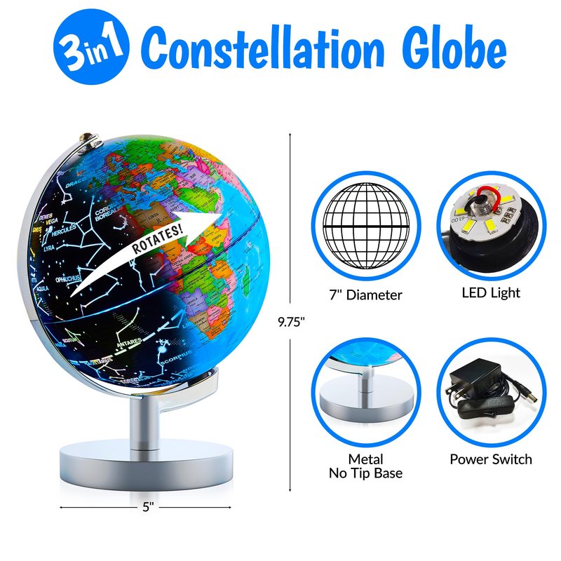 - DAY AND NIGHT FUNCTIONALITY: This illuminated world globe for kids features detailed, easy-to-read Earth geography including, continents, countries, capitals, deserts, reefs, major rivers, oceans, seas, and Earth’s natural wonders; Witness the amazing representation of 88 constellations that grace our night sky by switching on the soft LED light on this educational kids globe