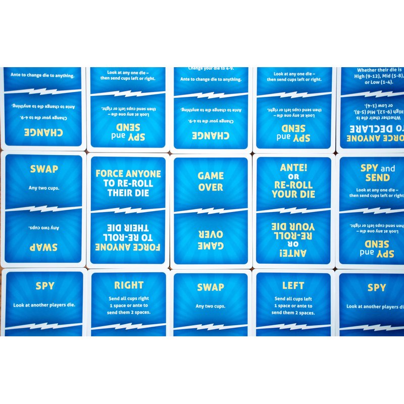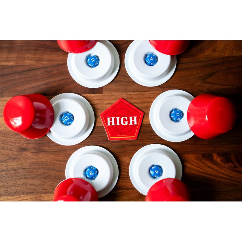 - HOW TO PLAY: Each player shakes their cup with d12, peeking at the die value. Play starts with drawing a card from the pile - the player can take the action on the card (Spy, Swap, Re-roll, Reveal) or choose to flip the High/Low token. Play continues around the table until the end round card appears from the draw pile - the player with either the highest or lowest dice value (based on the token) wins the round!