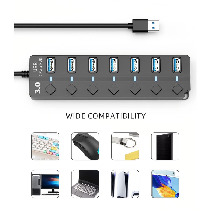 Usb hub with 7 individual on/off switches to control each USB port. USB 3.0 splitter hub saves the trouble of unplugging devices whenever you don’t need it. Turn on/off the port at your need.