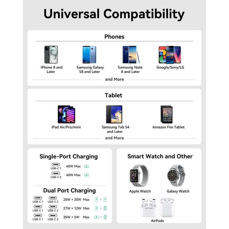 - 【Universal Compatibility】:This type c charging block compatible with All smartphones and tablets, such as iPhone 16/15/14/13/12/11/Pro/Pro Max/Plus/XR/XS/X/8/7/6, MacBook Pro/Air, iWatch Series 10/9/8/7/6/5/4/3/2/1/SE/SE2/Ultra 2, Galaxy S24/S23/S22/S21/S20/S10/S9/S8/A12/A13/A22/A32/A52/A53/A71/Note 20 10, Google Pixel 9/8/7/6/5/4, LG, Motorola, and more mobile phones, tablet, etc