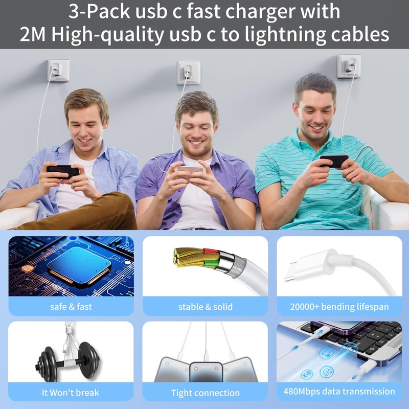 - [High-quality iPhone Charger Cable] Our Updated i.Phone fast charger cable has been strictly tested, including 15000+ bending test, 12000+ repeated unplugging test, load-bearing test etc., made of TPE, PVC and high-quality copper wires materials, which can withstand daily wear and tear, ensures fast and stable charging and transmission speed.