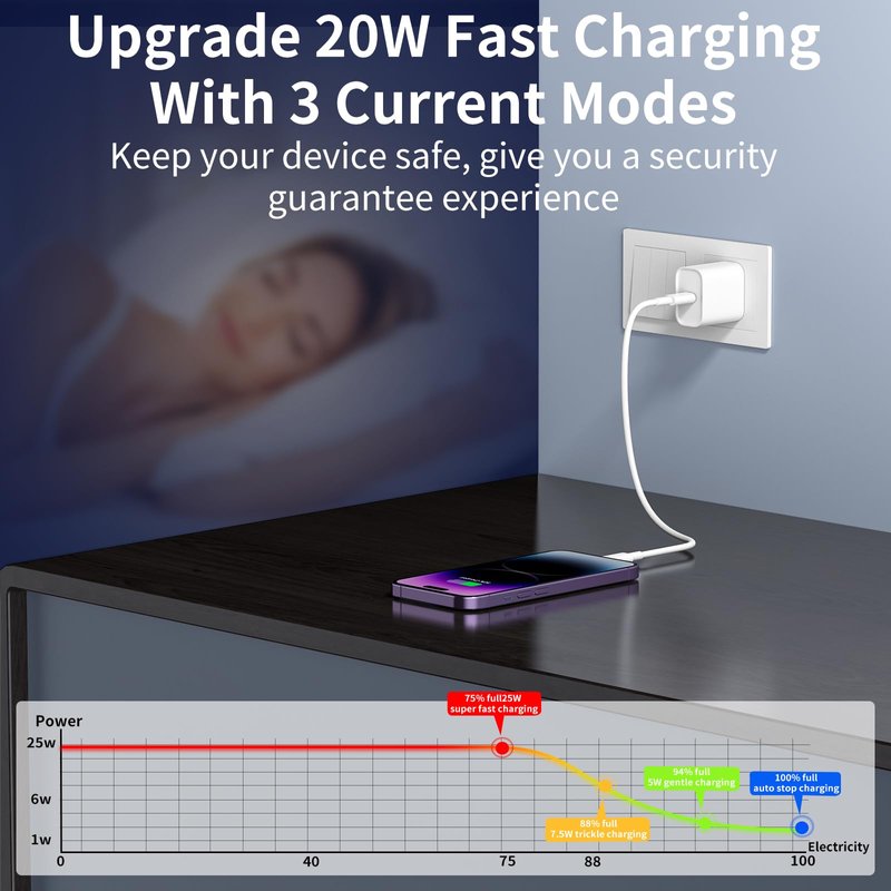 - [Super-Speed Charging] Our latest 20W USB C fast charger plug adopts PD 3.0 quick charge technology, which is 3X faster than 5W charger. Such as it can charge for iPhone 14/13/12/11 series to 50% capacity in about 25 mins, saving you more precious time.