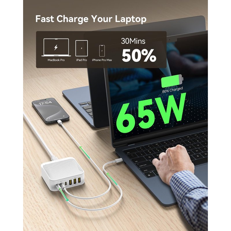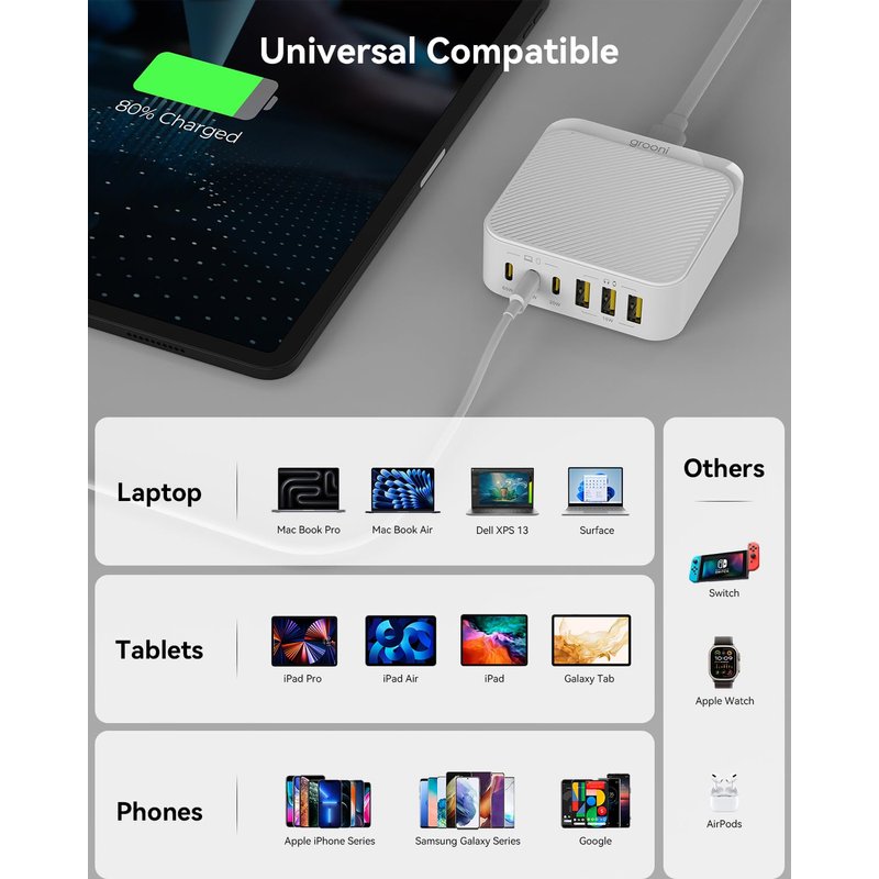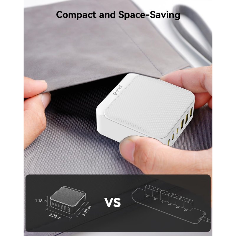 - ✅【Exclusive 6-in-1 Independent Fast Charging】Experience true simultaneous charging with grooni's USB C charging station. Our multiport fast charger block delivers a full 160 watts of power across six independent ports (3 USB-C, 3 USB-A). Each device enjoys its own dedicated power supply (C1: 65W, C2: 30W, C3: 20W, A1-A3: 15W), ensuring full-speed charging without the common problem of power output reduction or disconnection when multiple devices are connected.
