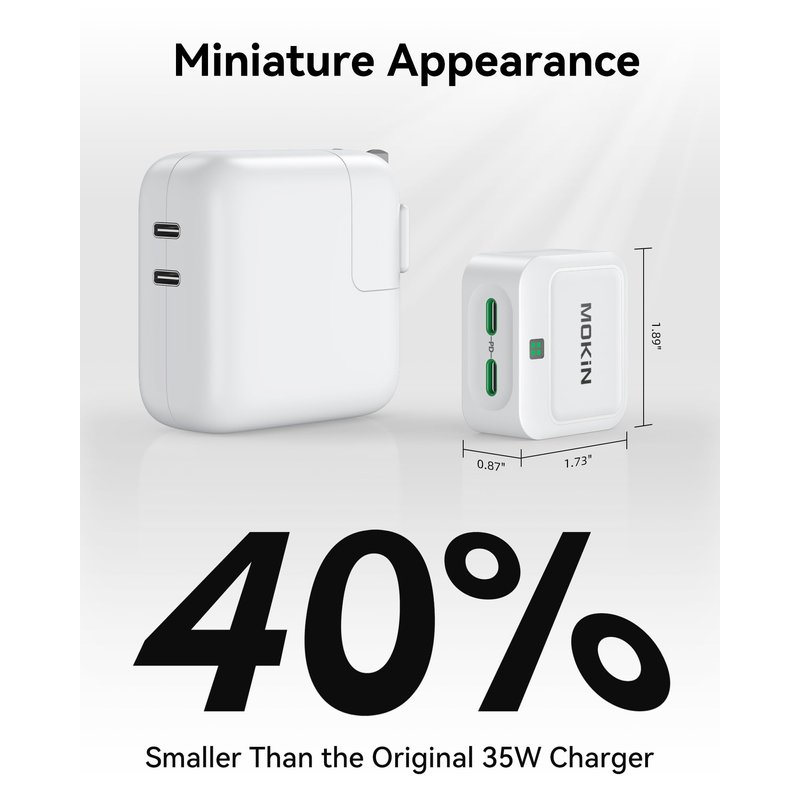- 【Compact and Portable】:Weighing only 2.47 ounces, this USB C fast charger features an ultra-compact and lightweight design that is 40% smaller than the original 35W charger, the durable ABS shell prevents scratches and has foldable prongs