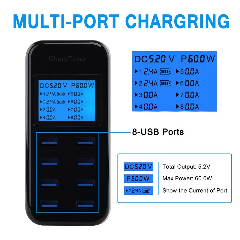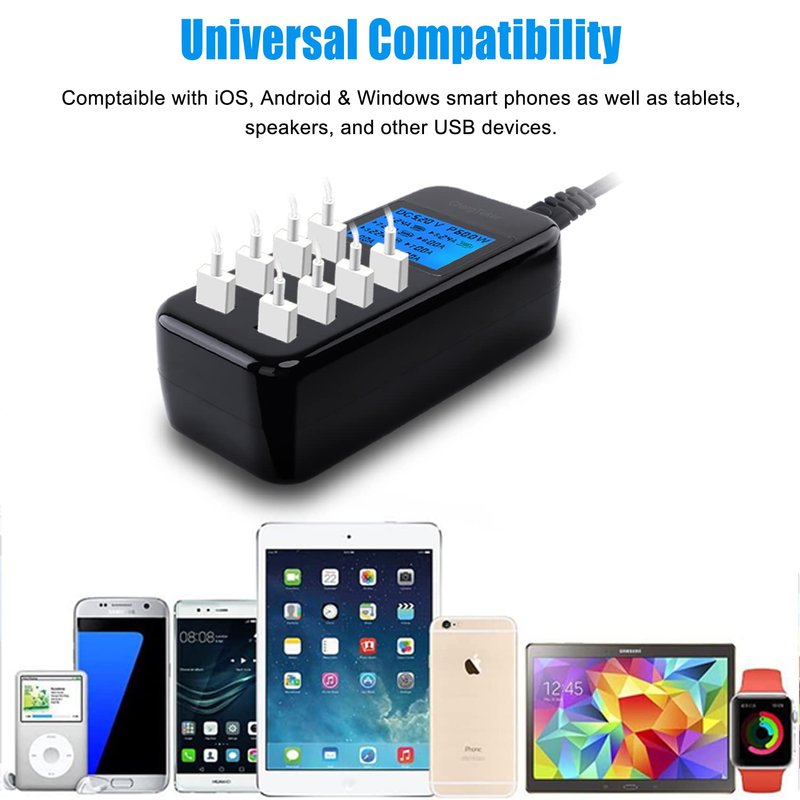 - 【ULTRA POWERFUL】 USB charger station can pump out total 60 watts of power equipped with auto detect technology via 8 ports, maximizing the highest charging speed and energy efficiency for each port, providing the optimal current and the quickest charge.