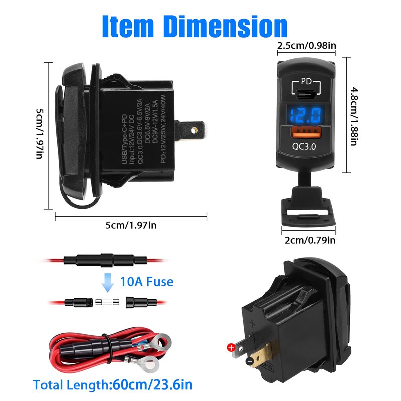 12V USB Outlet, Rocker Switch USB Charger USB C Car Charger and Quick 3.0 Adapter PD Charge Panel Motorcycle USB Charger Waterproof Blue Led Digital Voltmeter on Marine Boat Vehicle Truck RV Golf Cart