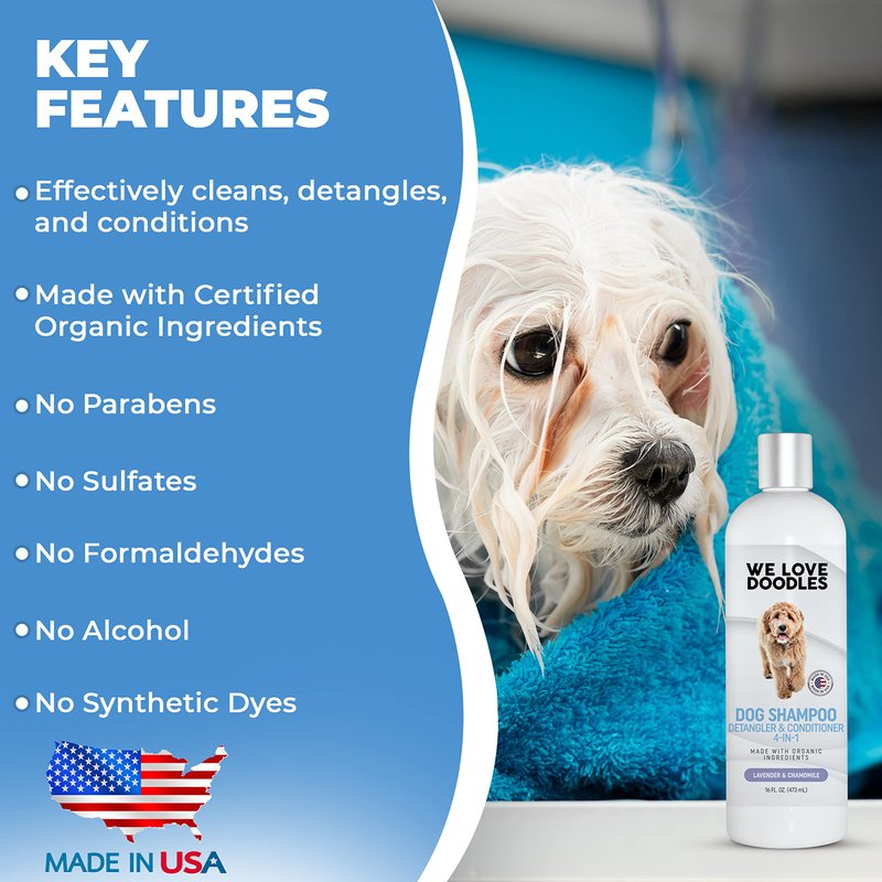 Our 4-in-1 Dog Shampoo, Detangler, Conditioner, and Moisturizer is designed for dogs with minimal shedding like Goldendoodles, Labradoodles, or Poodles. However, it works just as effectively on all dog breeds. It is safe and gentle to use on your dog’s coat and will help detangle for future grooming sessions. The key difference between our innovative dog shampoo formula is that is made of Certified Organic Ingredients. Additionally, it does not contain any harsh chemicals that can harm your dog's skin.