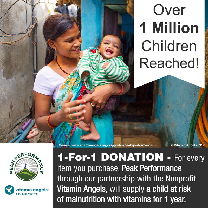 1-for-1 Donation - For Every Bottle You Purchase - Peak Performance through our partnership with the Nonprofit Vitamin Angels - Will Supply Vitamins To A Child At Risk Of Malnutrition For 1 Year!