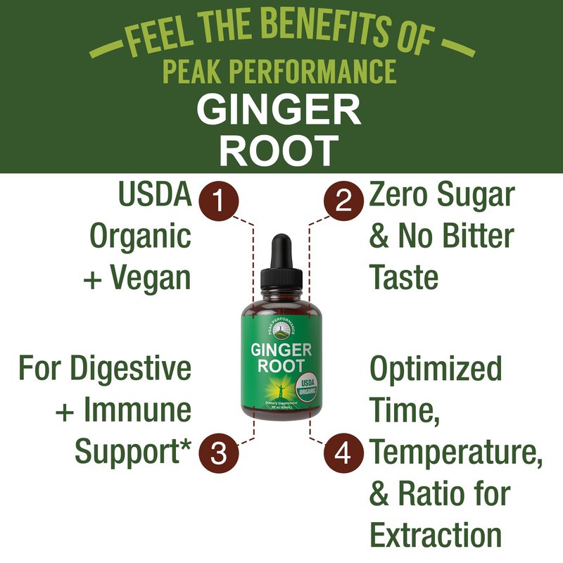 - Not All Ginger Root Extract Liquids Are The Same - many ginger supplements on the market are untested and unreliable. With Peak Performance USDA Organic Ginger Root Liquid Drops Supplement, you get the highest quality ingredients we could find. We created a balanced, absorbable formula with optimized time, temperature, and ratio for extraction.
