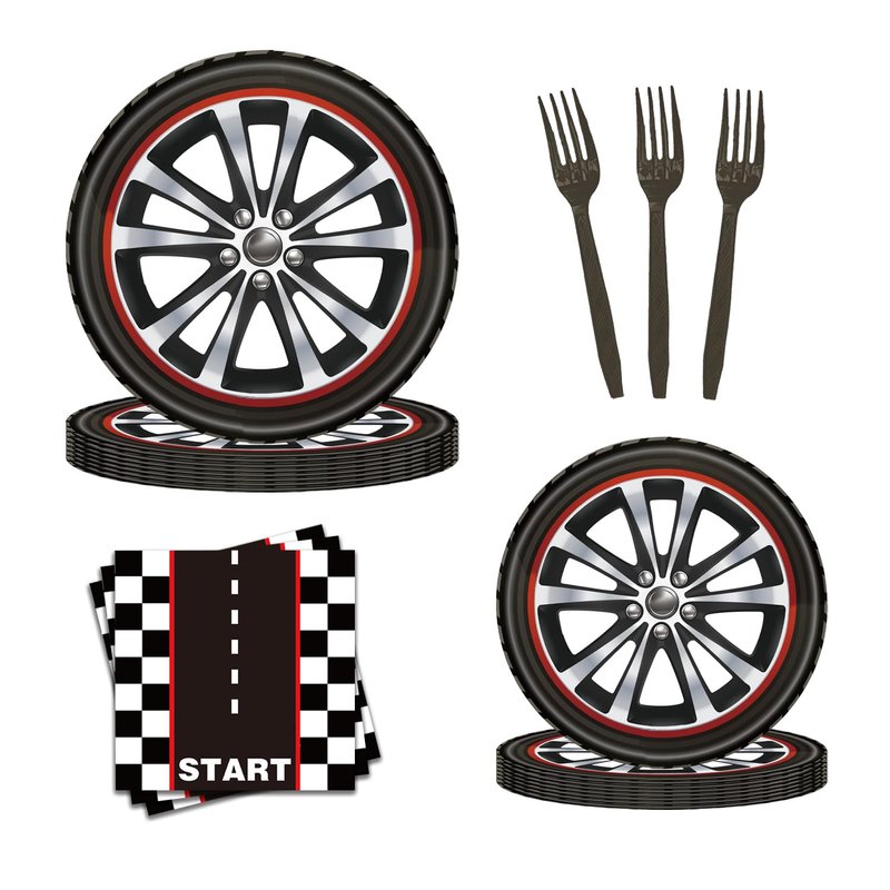 USERTEN 68 Pcs Racing Themed Party Tableware Racing Wheels Dining Plates and Race Tires Car Track Napkins Set for 16 Guests for Decorating Boys' Birthday Parties