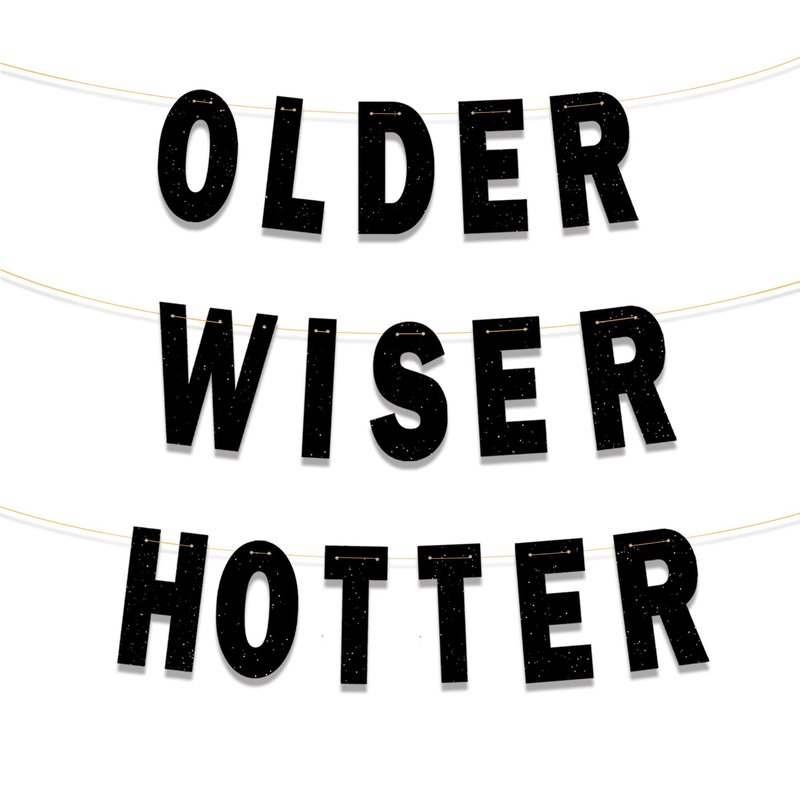 Ushinemi Black Older Wiser Hotter, Funny Birthday Banner for Men Women, Glitter Birthday Party Decorations