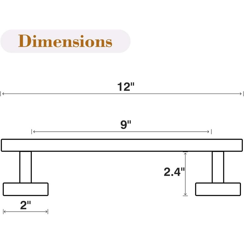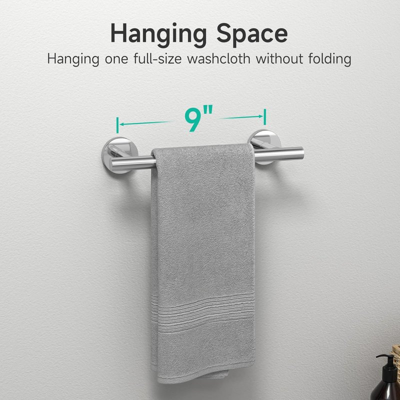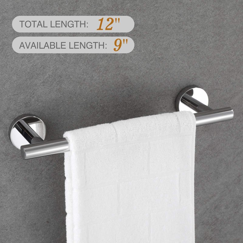 - 【9Inch Bathroom Towel Bar】 This towel holder with a total length of 12in and a hanging length of 9in is perfect for securely hanging one full-size towel without folding, making maximum use of the available space. (Fit 9in wall studs)