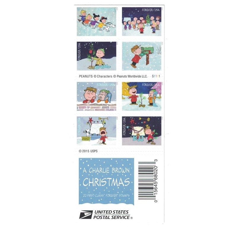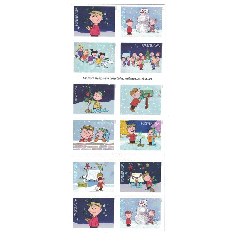 USPS Charlie Brown Xmas Pane of 20 Forever Postage Stamps Scott 5021-30