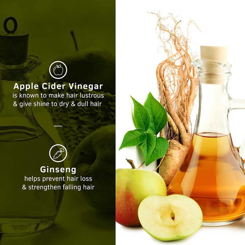 - Rejuvenates and Cleanses Scalp - It is loaded with Apple Cider Vinegar which is known to give dry and dull hair a lustrous finish. We've also added Ginseng, an ancient Chinese ingredient, which is known to prevent hair loss and also help strengthen weak and falling hair.