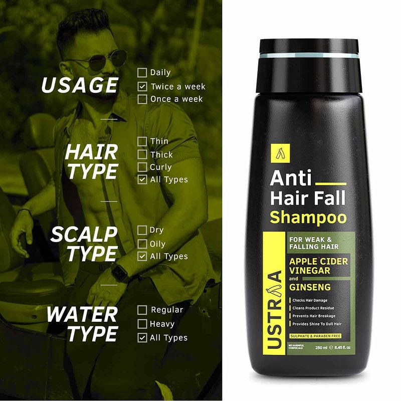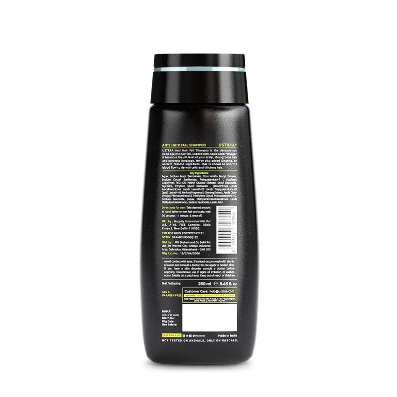 Ustraa Anti Hair Fall Shampoo with Apple Cider Vinegar - Prevents Hair Fall, Strengthens Weak & Falling Hair and Adds Shine & Lusture to Hair - Sulphate & Paraben Free - 6.76 oz