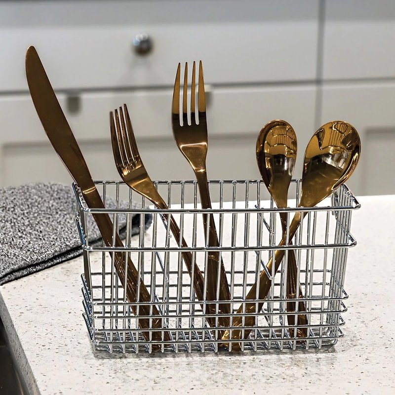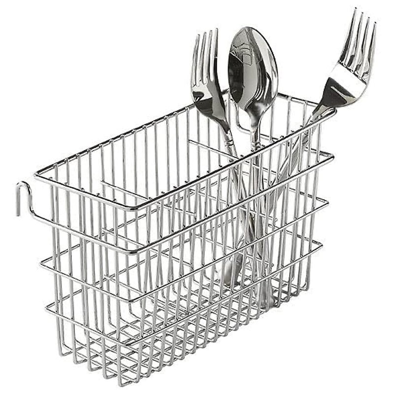 This attractive metal cutlery basket is made of durable chrome to stand the test of time and to enhance your kitchen decor. The interior of the utensil basket is divided into three compartments, for tidily separating forks, spoons and knives. No assembly required-there are convenient hooks on the side of the basket to attach it to your folding dish rack.