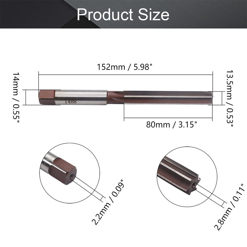 - 【9Crsi Alloy Tool Steel Reamer】- Hard and durable, reaches H8 level of drilling accuracy, and reduces surface roughness of workpieces.Cutting Diameter: 14mm / 0.55",Tool Flute Length: 80mm / 3.14",Overall Length: 153mm / 6.02".