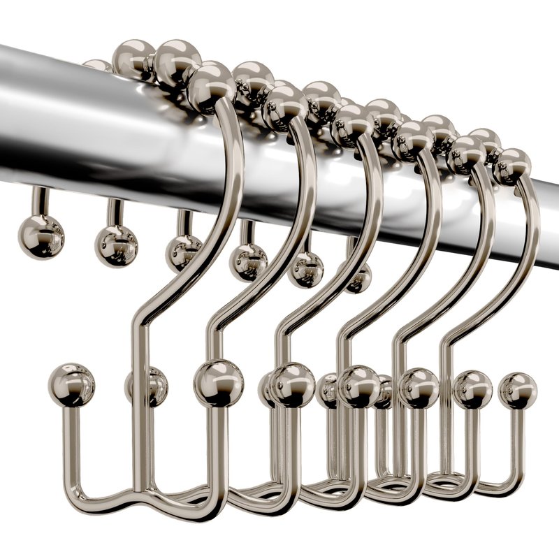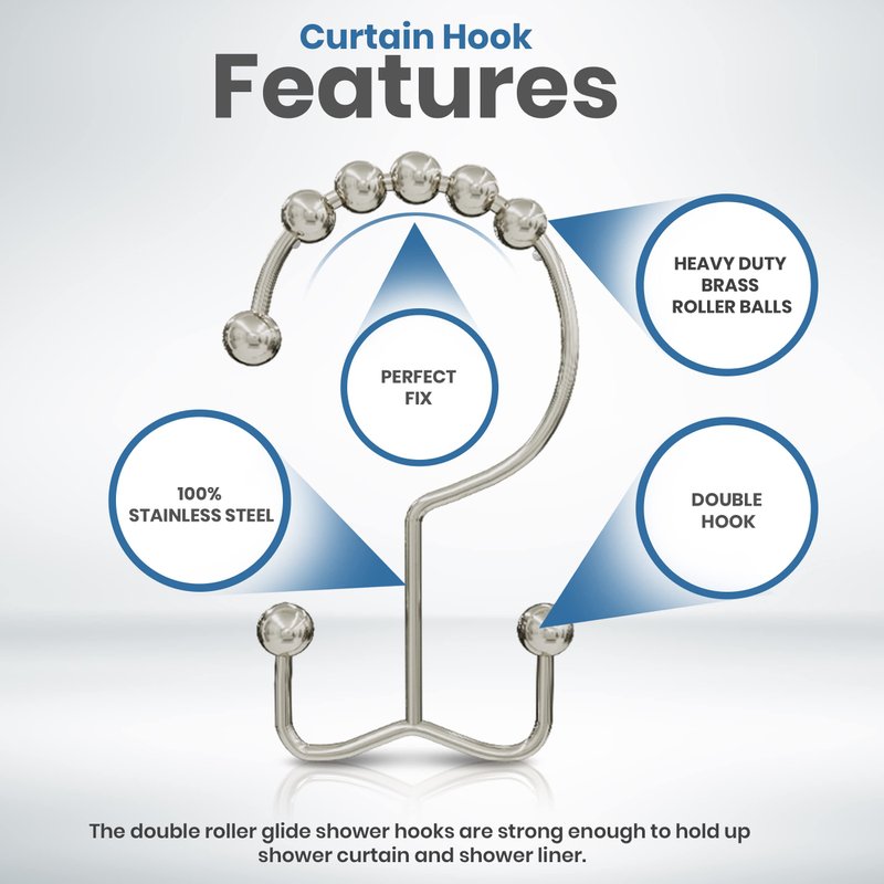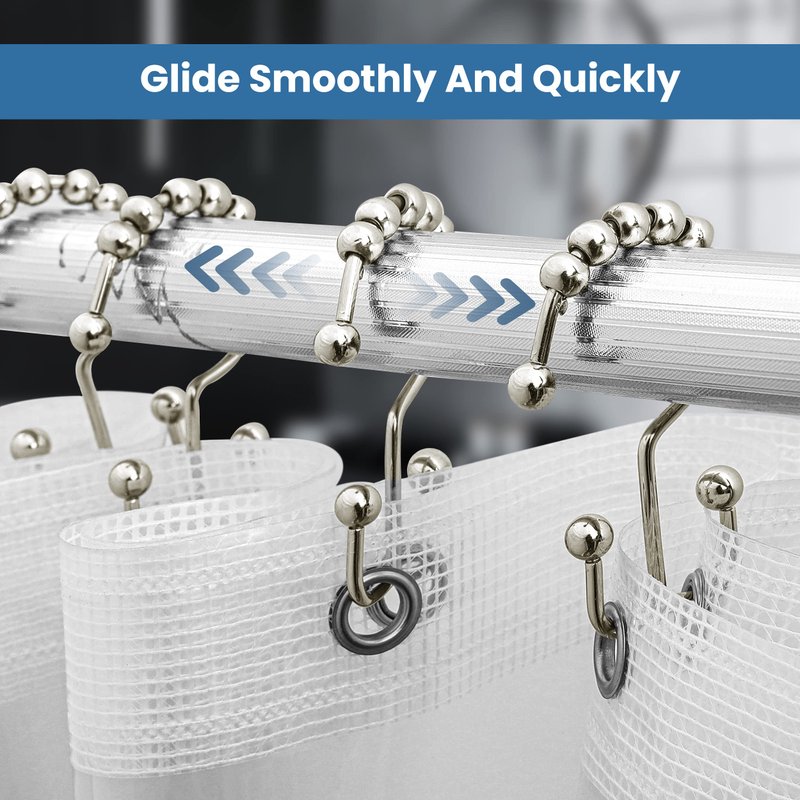 - FRICTION-LESS GLIDING - The five spherical balls atop the shower curtain hooks help you to glide the curtain or liner effortlessly across the curtain rod without scratching it.