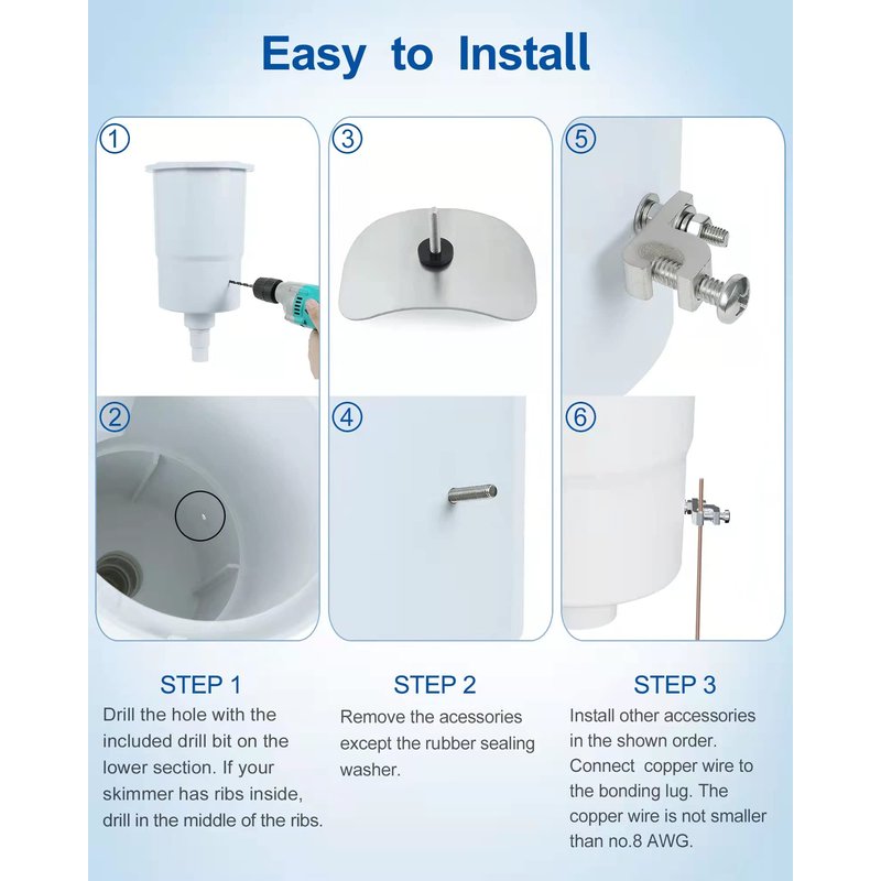 - EASY TO INSTALL: The pool skimmer bonding kits are placed on the side wall of the skimmer on the lower section where the basket is held.