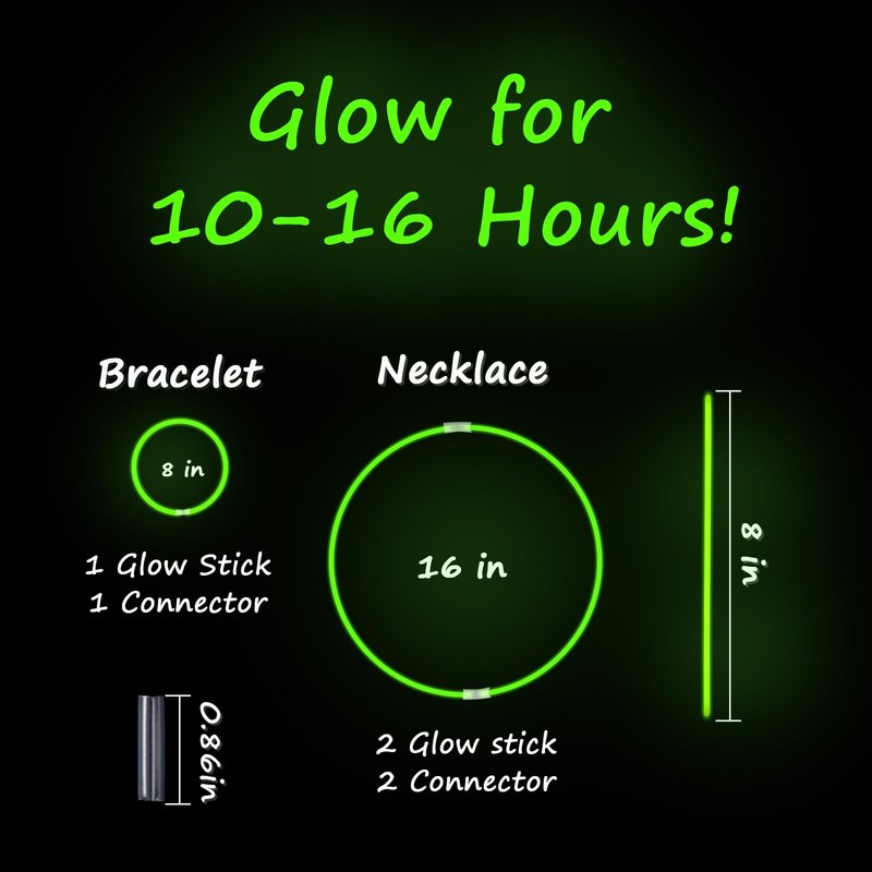- EASY TO USE: Long-lasting and eye-catching. Bend, snap, shake and you’re ready to go. Our 8-inch long glow sticks glow bright for 10-16 hours.