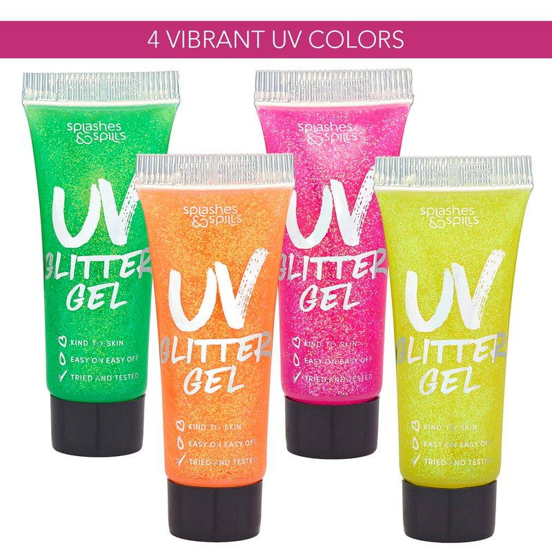 - UV GLOW IN THE DARK GLITTER GEL: Add an extra layer of dimension and fun to your makeup and hair looks. Splashes & Spills UV Glitter Gel is great for your hair too! This unique glitter makeup glows under UV light and flaunts rainbow hues.