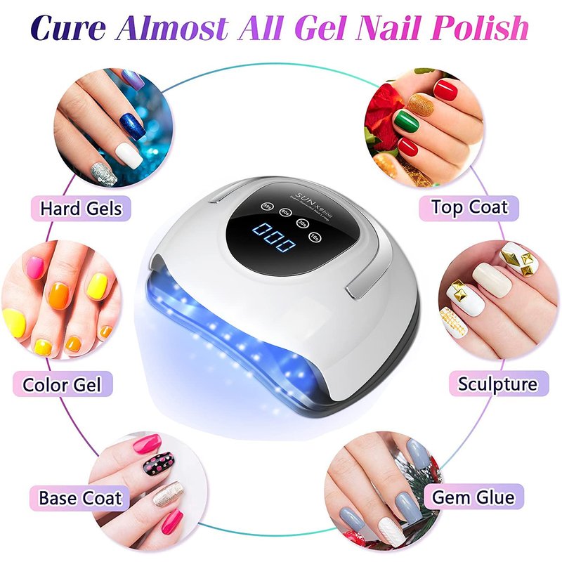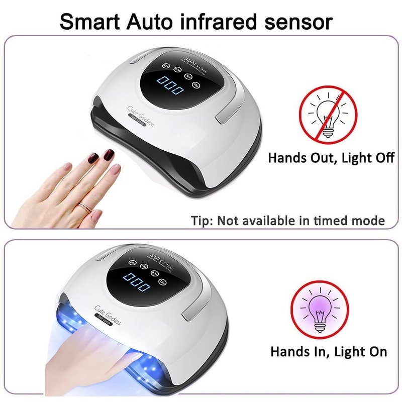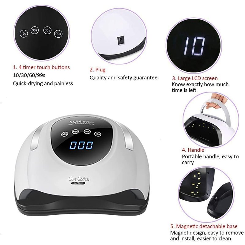 150W UV LED Nail Lamp UV Gel Nail Lamp is an ideal party staple for every girl in a professional nail salon,applicable to every brand and type of nail polish.With nice clothes, makeup and a fancy manicure, the outfit makes you shine even more. Our 150w high power UV&LED Gel Nail Lamp, whether you are a student or a worker, could be easily used,no less than a nail salon. What makes our nail dryer more suitable for you? Large space, can put both hands at the same timeSuper high power, super multi lamp beads, fast drying time Auto-sensing function, easy to use Detachable base for drying toenails Can dry all types of uv led nail gel polish There is a low heat mode, it will be more comfortable to use How To Use Nail Lamp ? Step 1: Clip your nail to an appropriate length. Cap the nail edge, file the surface of the nail, remove the cuticle, trim the edge. Step 2: Apply a thin layer of the Gel Polishes according to its usage instructions to the clean, dry nail without touching the cuticle or skin alongside the nails. Step 3: Connect the power cord to a secure outlet. Use the appropriate timer (10s/30s/60s and one automated setting at 99s Low Heat Mode) as per your gel polish's requirements. Step 4: Please note that curing time vary based on gel polish brand. PHIAKLE UV LED nail lamp works well for all kinds of gel polishes, not for regular nail polish. Step 5: If gel polish is a little sticky after curing, please wipe your nails with a gentle cleanser or rubbing alcohol to get rid of the sticky residue left behind. Packing list: 1x 150W Nail Lamp 1x US Plug 1x User Manual