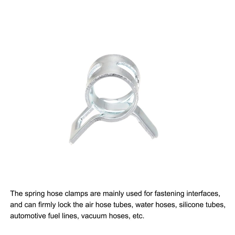 - [Application]: The spring hose clamps are mainly used for fastening and sealing interfaces, and can firmly lock the power equipment fuel lines, air hose tubes, water hoses, silicone tubes, automotive fuel lines, vacuum hoses, etc. Widely used in the automotive, marine, lawn mower, agricultural, material handling, factory and construction industries.