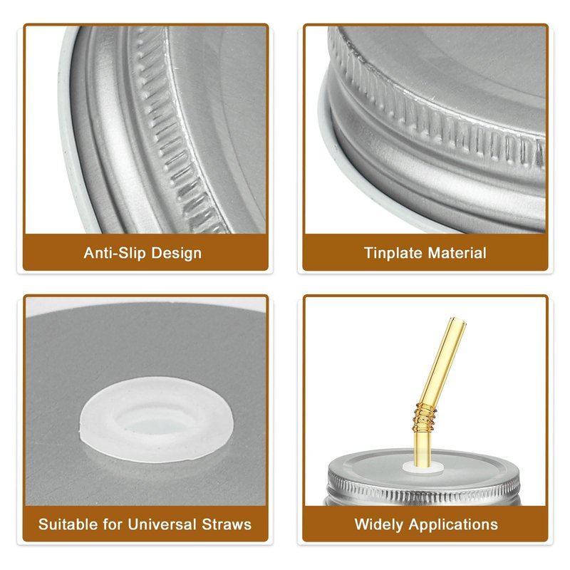 - [Material] - The mason jar lid with tinplate materials, can be used repeatedly, not easy to deform and long-lasting durability; The material is not worried about oil and is easy to clean, and this lid can be used in microwave, refrigerator and dishwasher.