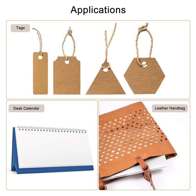 - Applications: Specially used for punching tags, wall calendars, desk calendars, account books, and handbags. Suitable for ordinary paper, offset paper, coated paper, grease film paper, leather, fabric etc.