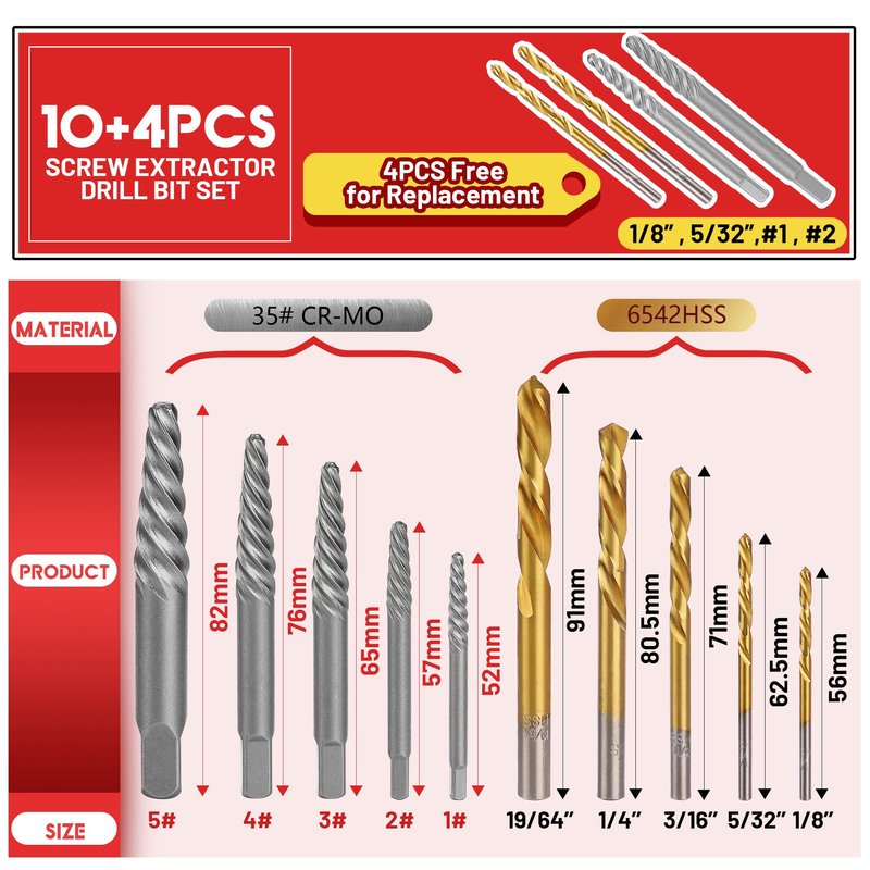 - ★ Diverse Sizes - 14 pieces Extractor Screw Extractor Set. Working sizes - 19/64",1/4",3/16",2*5/32",2*1/8". Spiral screw extractors include 2*1#, 2*2#, 3#, 4#, 5#. Impact drive for all kinds of job applications.