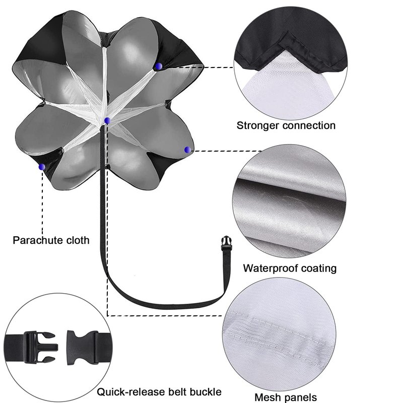 - 🏃DURABLE -Made of high quality parachute cloth, Built-in mesh panels keep strings from tangling and helps stabilize the chute during training.