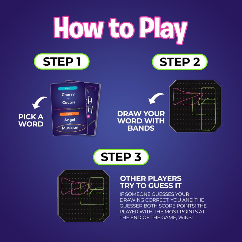 - Challenging and Rewarding: Choose from easy or hard prompts and race against time to sketch using rubber bands. The quicker your opponents guess, the more points you both earn, making it an engaging game of skill and strategy for all participants.