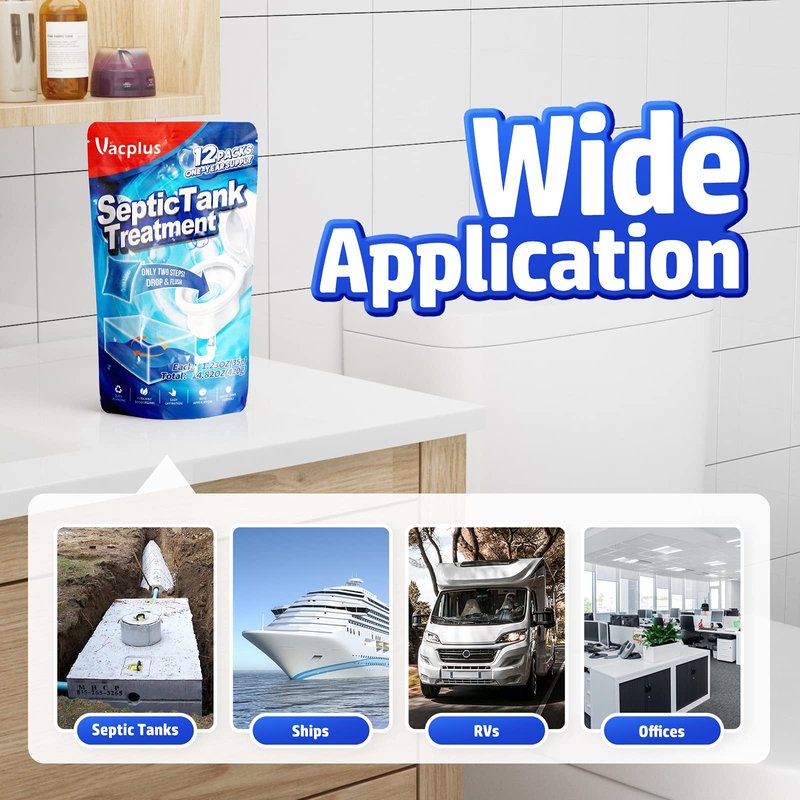 ② Vacplus septic system treatment can be widely applied in almost all kinds of septic tanks and sewage tanks. You can use it in the toilets of houses, marketplaces, boats, and RVs. It will dissolve wastes, prevent buildups, and remove odors, saving you much money on the maintenance of the septic tanks.