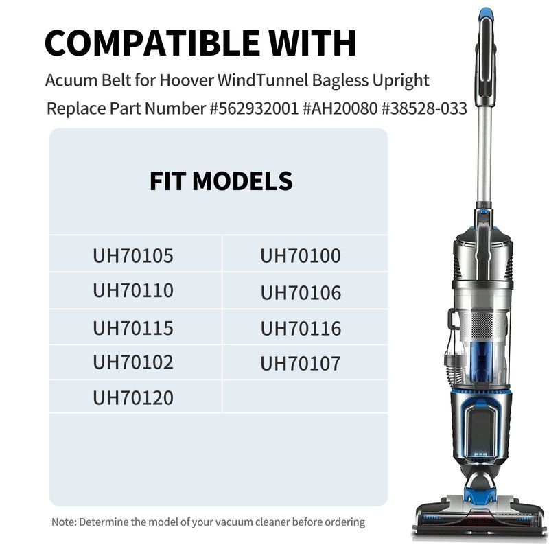 - 【Compatibility】Vacuum Belt 562932001 for Hoover WindTunnel Bagless Upright. Replace Part Number #562932001 #AH20080 #38528-033. Fit Models: UH70105 UH70100 UH70102 UH70110 UH70106 UH70107 UH70115 UH70116 UH70120.